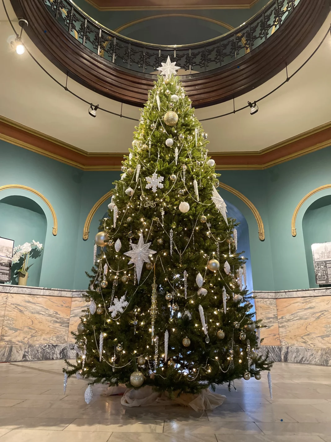 The 19th-century Beaux Arts landmark has a regal tree to match its elegance. Perched under the cupula, this slender timber is draped in strings of beads and artfully dotted with gold and white snowflakes, orbs, and icicles. Topped with a pendant star, it quietly commands rapt attention. (A bonus: When you leave, keep an eye on the clock tower to spy it awash in red and green lights!)