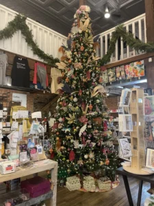 This boutique employs a fanciful tree to welcome guests. Adorned with colorful ornaments, clutches of feathers, and felt garlands, it exudes a cheerful “hello” during your holiday shopping. The longer you look at this tree, the more hidden gems you will find. (Or want to buy!)