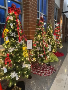 Peoples Bank’s festive decor doubles as a contest to bring support and public awareness to nonprofits. At each branch, a miniature tree’s theme is tied to the organization’s signature items. For example, the Ronald McDonald House’s tree is decorated with photos and the man himself. Warrick County Humane Society’s display resembles Snoopy’s doghouse. The Hope Gallery of Newburgh has stuffed a tree full of colorful, handmade tile ornaments, and the Sharon Elementary School tree sports its school spirit! To vote, go to the Peoples Bank Facebook page and drop a like. The winning organization will receive a $1,000 donation.