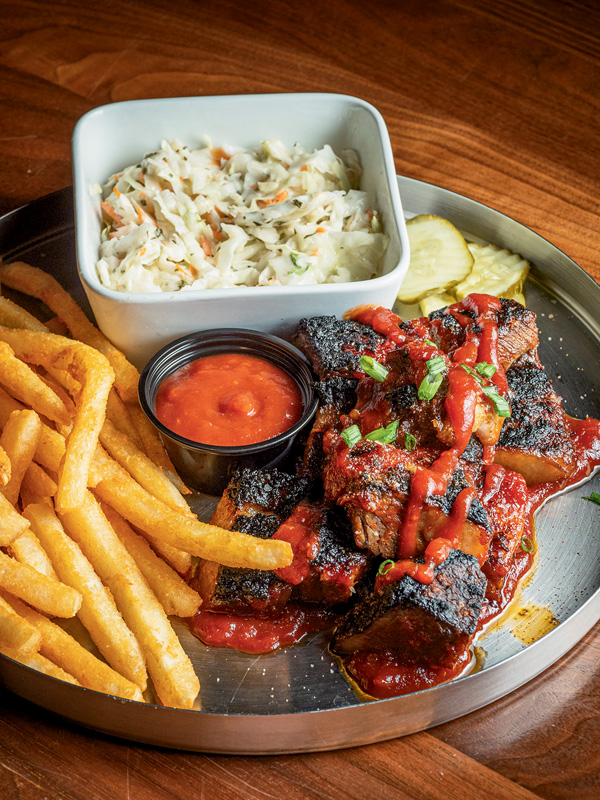 Room Chef Vince Bowden ranks his favorites based on the preparation process and loves cooking the Burnt Ends entrée — a pile of enticing beef burnt ends topped with homemade barbecue sauce with French fries, cole slaw, and a side of pickles.