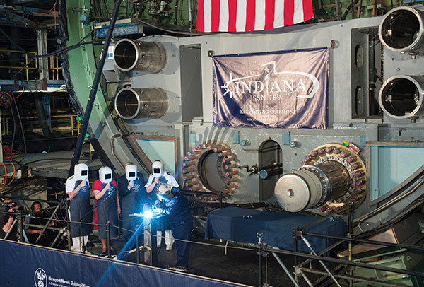 The USS Indiana SSN 789 is being built at Huntington Ingalls Industries-Newport News Shipbuilding in Newport News, Virginia. The christening of the attack submarine is planned for April 29 with a traditional breaking of a bottle against the bow.