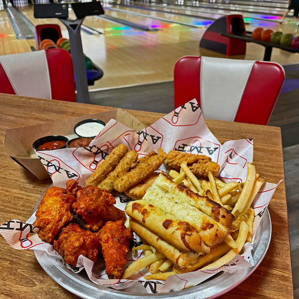 AMF has a full snack bar offering appetizers, shareables, burgers, and sandwiches. We tried the Alley Sampler for $23.79. A pile of cheesy breadsticks, French fries, hot wings, mozzarella sticks, chicken strips, and sauces to go with each item.