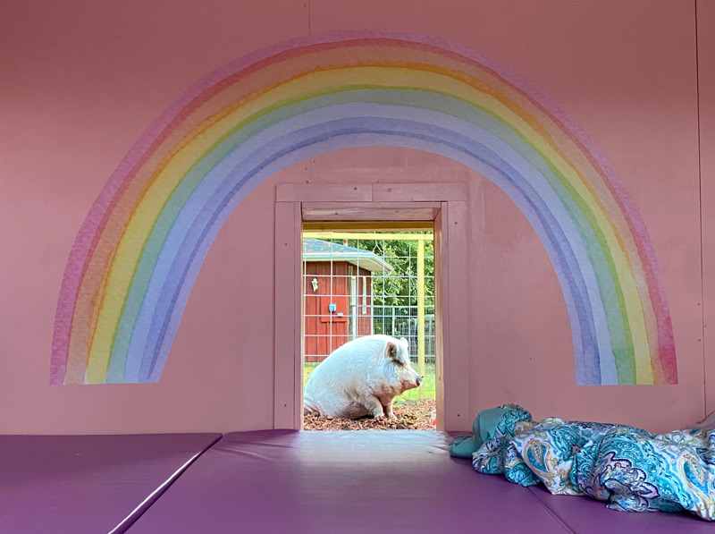 Toni says Tutu is settling in very well with her three pig siblings Teddy, Tilda, and Rupert. (The Howley family also includes five rescue dogs.) The family renovated an old mowing shed on their West Side property into a condo just for her. The condo is complete with bright pink walls and tumbling mats on the floor as a softer surface for her joints. Thus far, she’s been enjoying grazing and lying out in the sun. Toni says Tutu is a very sweet and vocal pig who will start talking to you right when she sees you.