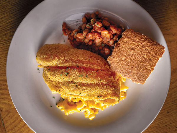 At the Hornet’s Nest, head chef Jeremiah Galey always tries to mix it up. One popular plate lunch features catfish, baked beans, and macaroni and cheese.