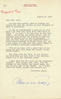 Under glass on a conference table outside of President Ford’s office in the library (which he used during his visits there), copies of notable correspondence are on display. Maria Von Trapp (the real one, she notes) admonishes First Lady Betty Ford for the forward-thinking comments she made on 60 Minutes in August 1975. An archivist showed us the president’s baby book – he was born Leslie Lynch King Jr.; his parents separated when the future president was just two weeks old.