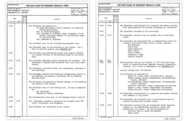 Now, here’s cool connection, finally! Writing my letter for July/August issue of Evansville Living, I researched Vanderburgh County events of 1976 – the Bicentennial Year – seeking information I might use as the county celebrates its 200th birthday this year. Top in the search result was a document Scanned from the President’s Daily Diary Collection at the Gerald R. Ford Presidential Library, April 23, 1976 – the day President Ford flew to Evansville on the “Spirit of 76.”