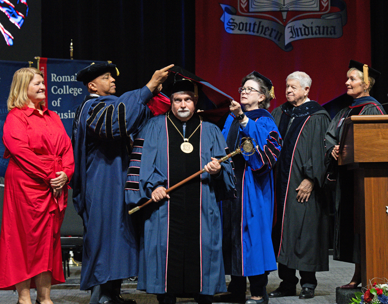 Looking out over the crowd gathered in Liberty Arena on Oct. 16, Cory Bridges thought all the pomp and circumstance was nice, but perhaps a bit overdone for his “Little League coach.” The punchline? That coach was his father, Steven, and the pomp celebrated the longtime University of Southern Indiana employee’s inauguration as the college’s fifth president.