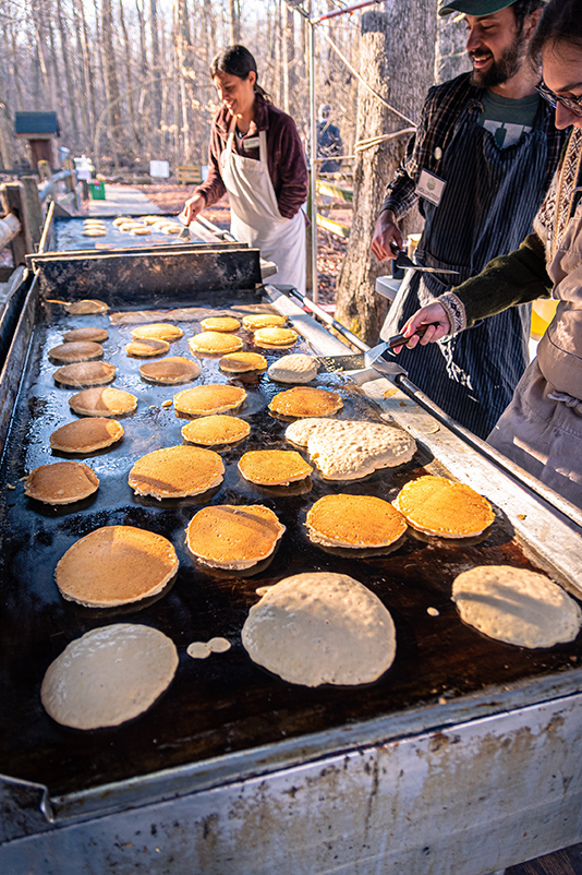 “Volunteers are essential to pulling this off,” says Kristina Arwood, Wesselman Woods director of marketing and community engagement. Last year, 275 of them served 330 pounds of pancake batter, 14 gallons of syrup, and 4,000 sausage links to more than 1,580 attendees.