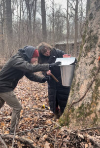 Tapping is a form of pressure release that poses no danger to the tree if performed early, so Wesselman Woods’s staff typically begins in early or mid-January when winter temperatures allow tree sap to move through a freeze-thaw process. They select trees with a minimum 10-inch diameter and tag them with a yellow ribbon. Traversing into the nature preserve’s grove of sugar maples — a sugarbush — sugar tapping volunteers drill 1.25 inches into each selected tree to reach the sapwood. After cleaning the drilled hole of shavings, a spigot is hand-screwed in and hooked up to a bucket and cover to ward off water and insects.