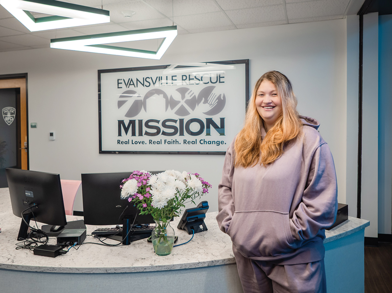 Women undergo an initial interview before becoming residents and participating in a 77-week program that includes classes on faith, self-care, harm reduction, and life skills. A technology lab, Bible studies, and group counseling round out the curriculum. “ERM taught me how to balance a checkbook, write a check, pay bills online,” says Jaynia Spencer, one of the CWC’s first residents. After moving from Springfield, Illinois, to Evansville for a job and a safer environment in December 2023, she struggled to find permanent housing for herself, her mother, and her two daughters. After a period of uncertainty, she now is one of the first people to greet new residents.