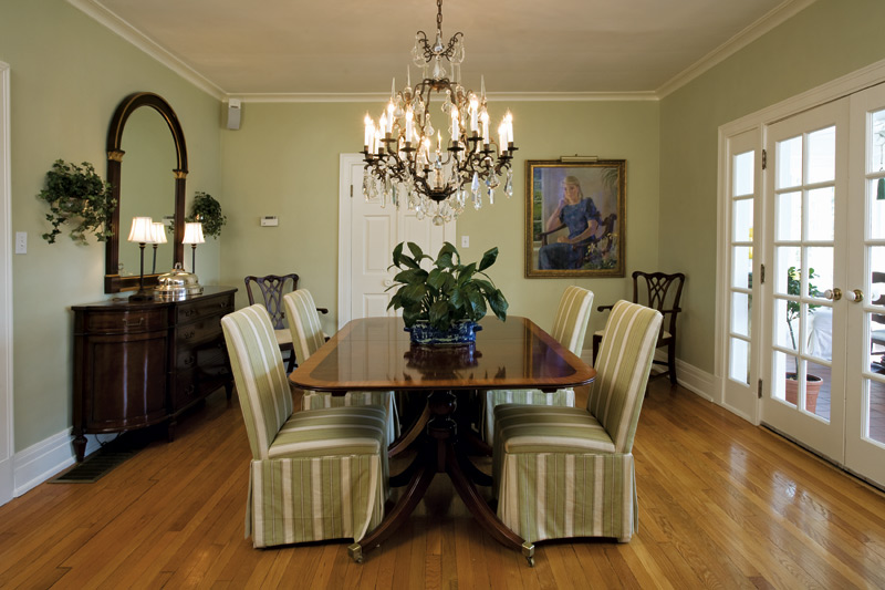 The elegant dining room features formal furnishings and family silver collectibles set against gleaming original oak floors. An elegant crystal and bronze chandelier illuminates the room. “My mother gave me and my sister several pieces of her silver when we both got married,” says Missy. “Each piece has special meaning to me because I grew up with it in Ohio.”
