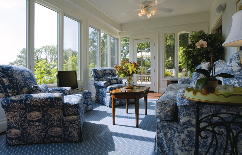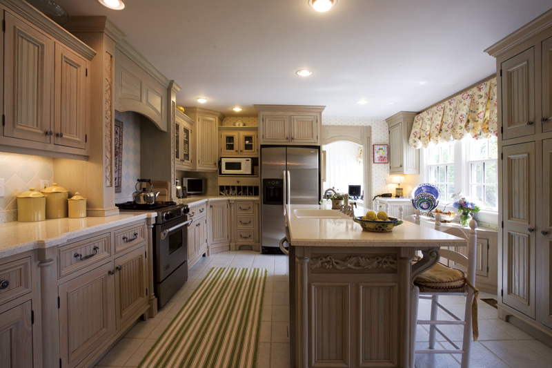 In the kitchen, antique cabinetry showcases Missy’s collection of blue and white pottery — a favorite color combination found throughout the property in toile fabrics and outdoor furnishings. “My mom collected blue and white pottery,” says Missy, “and I got hooked on it, too. I always liked it, so I started buying it at antique stores.”