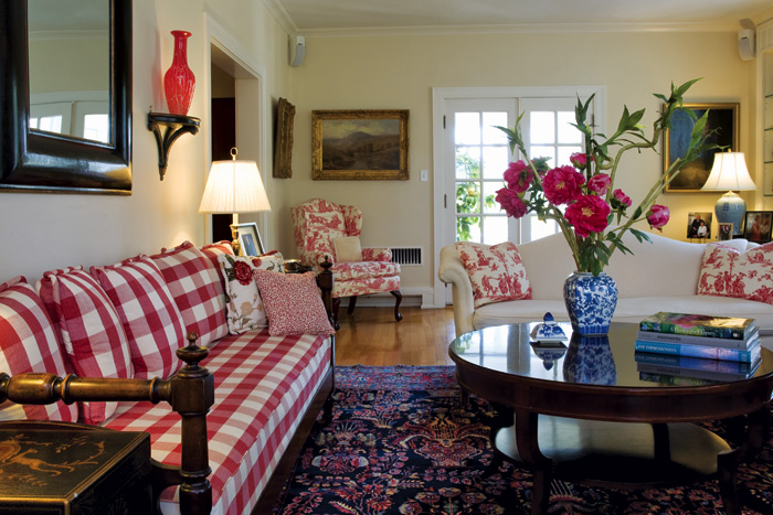 Missy also has a penchant for rich colors. She incorporates vibrant hues of red, yellow, and green with the blue and white color palette. “I like the way the bright red and yellow pop against the blues and greens,” she says. “It livens everything up, and I think it gives all our antiques a more contemporary feel.”