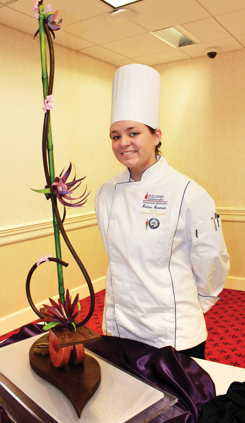 Newman also receives one-on-one training with her chocolate coach, Chef Scott Turner, the associate chair of the baking and pastry arts department and an instructor at Sullivan University for nearly 12 years. “He is always pushing me to work cleaner and to strive for perfection in every detail,” she says. “It’s not always about going bigger, but making sure that each flower petal or leaf is perfect.”