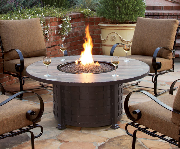 The 54-inch Round Chat Height Classico Fire Pit has a solid wrought iron base with an intricate cast aluminum hearth top. Four people can sit comfortably around the table, which operates on liquid propane or hooked up to natural gas. The base of the table is a lattice style and includes a latching door that hides and secures the propane tank.