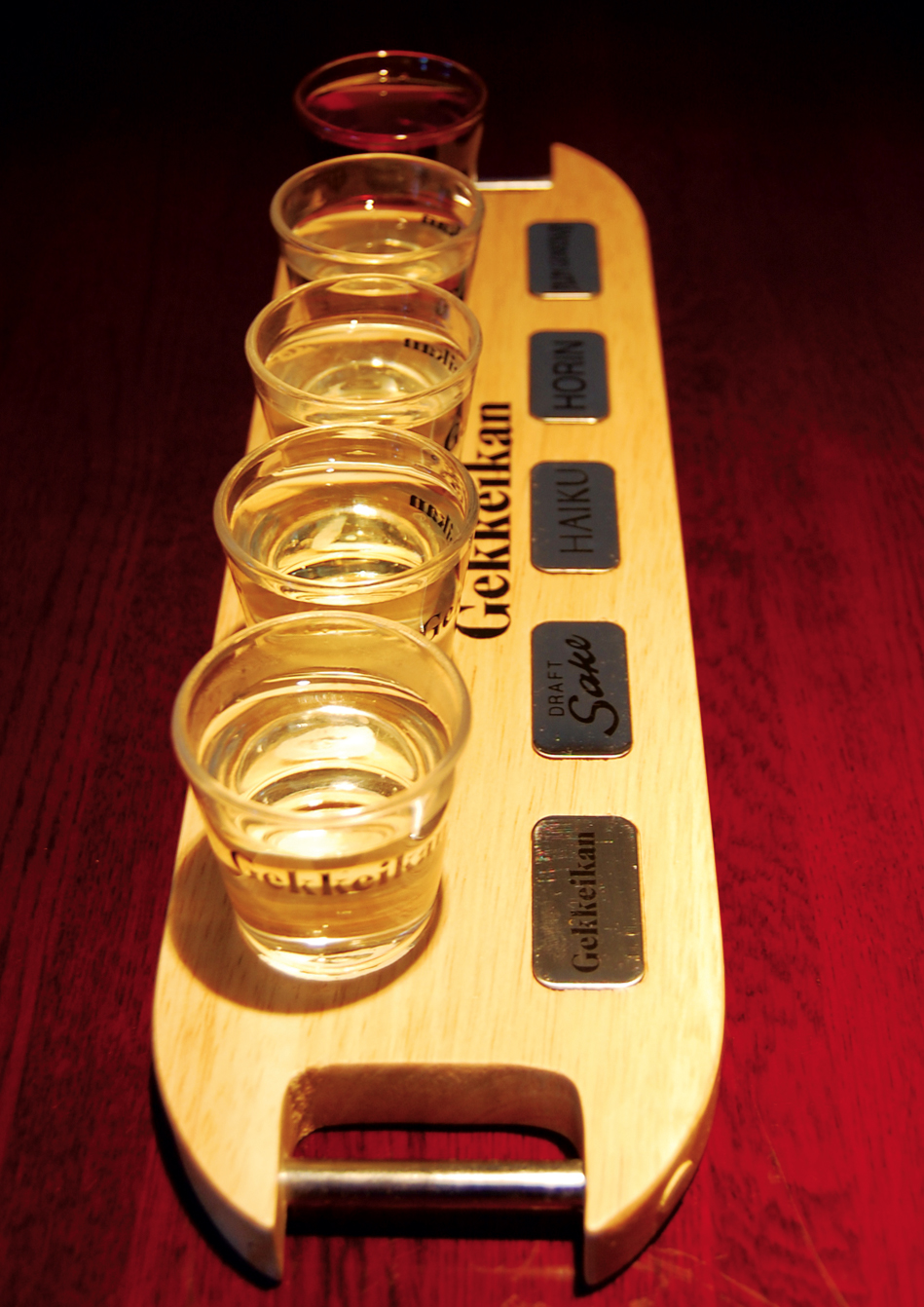 At Tokyo Japan Restaurant (3000 N. Green River Road), the sake options are more bountiful. Fifteen sakes are on the menu, and the sake flight, known as the Gekkeikan Sake Experience ($12), is an opportunity to find a sake suitable to your tastes. Five glasses nearly triple the size of shots line a wooden plate. On the end with lightest color is hot sake, served as a classic choice. The rest are chilled, indicating a higher quality, says Will Sun, store manager and head sushi chef. Next to the hot sake is a chilled, bottled sake with a similar but cooler taste. The middle sake, Horin, is smooth, and the darkest sake, Plum Gekkeikan, is sweet, almost like a plum wine. Next to the plum sake is Hurin, a dry contrast.