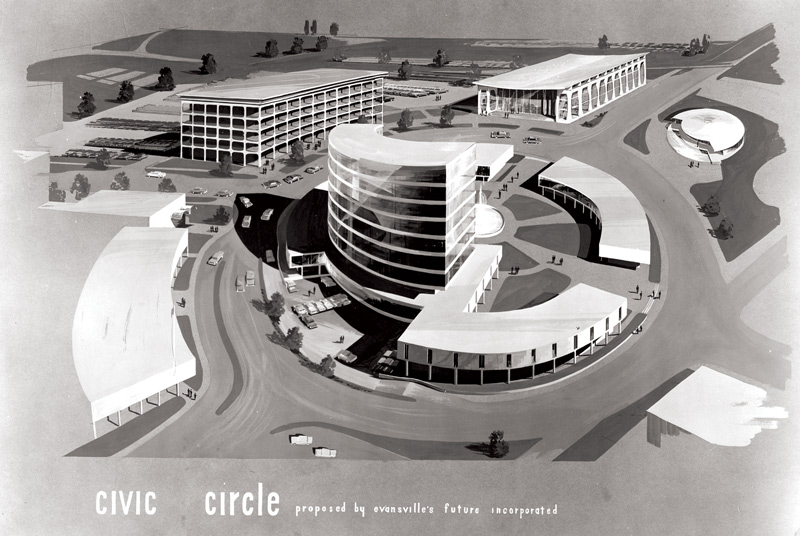 Evansville’s Future commissioned the architectural firm Heronimus, Knapp, Given, and Associates to design a modern cluster of buildings inside and out of a European roundabout which would keep traffic moving north and south from the river to Garvin Park, yet permit development of both a new Federal Building and post office, a county auditorium and a city/county high rise office building with parking garage. The design was unveiled at a star-studded luncheon at the Vendome Hotel on March 12, 1963, and received rave reviews from the public and the business community.