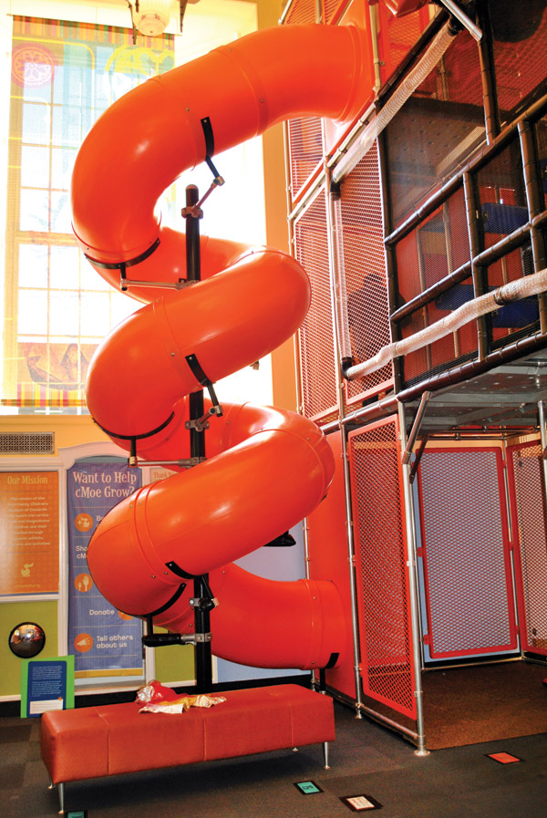 A 26-foot tower climbs to the top of the second story and spirals back to the floor in the form of an orange slide. A bridge extends to another tower at the far wall. Wispy scarves slip up tubes with the help of a fan and glide from the ceiling into the hands of intrigued children.