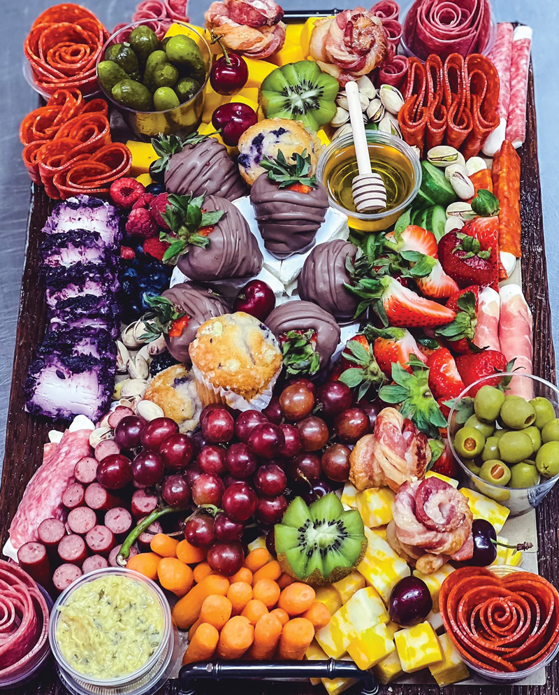 Grazing boards look like charcuterie boards but usually offer bite-sized fruits or vegetables, complemented with sauces, dips, honey, and/or jams. Flavored butters or favorite cheeses may be added. A grazing board’s potential for expression is endless, Machen says. A breakfast-themed board may offer mini waffles. A Mexican theme lends itself to tortillas and dips.