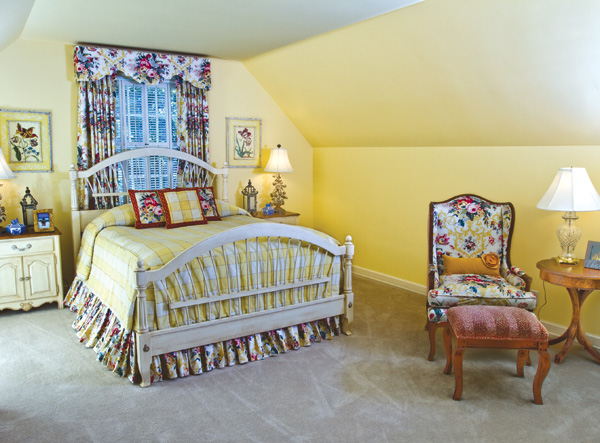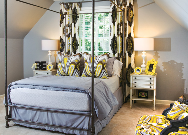 In her daughters’ rooms, she wanted every piece to fit together perfectly with more printed fabric and wall coverings like the rest of the house but with splashes of youthful influences. Offsetting the flowery curtains and comforters in one bedroom is a framed chalkboard covered with a child’s handwriting. A different room uses unusual, yet sophisticated blends of gray, yellow, and black with bedposts that nearly reach the ceiling. Every room carries the classical theme, but every room carries a unique character.