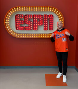 Lyles notes to Evansville Living that the rise of his own journalism career is tied to Evansville — specifically, the University of Evansville men’s basketball team’s upset of then-No. 1 Kentucky on Nov. 12, 2019, on the Wildcats’ home court at Rupp Arena in Lexington. Lyles, working for SB Nation at the time, was at UE’s practices prior to the game, and he rode with the Aces to and from Rupp Arena. Lyles says his coverage of the game, which included viral celebration footage in UE’s locker room, led to his hire by ESPN.