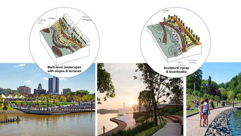 This design pulls the park back into the city and creates a continuous riverfront green space experience with multi-level spaces for gathering and diverse activities, according to Sasaki. The park would connect the city level and water’s edge through slopes and terraces linked by meandering paths, shade, and greenery.