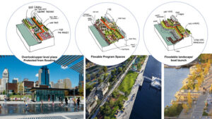 This plan pushes the city’s edge closer to the river and creates a new urban frontage for waterfront retail and other mixed uses. The new urban edge offers what Sasaki calls “rooms” for different programs, activities, and experiences along the river while unlocking new development sites that could help fund and support the envisioned improvements.