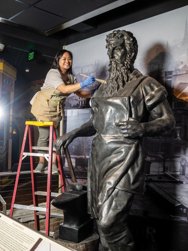 Kaman Hillenburg demonstrates how she uses a paintbrush to carefully clean a 9-foot, 6-inch figure of the Roman god Vulcan at the Evansville Museum of Arts, History & Science. The museum’s collections manager says she likes ribbing visiting children: “I’m the one who gets to touch everything that we say they can’t!” she laughs.