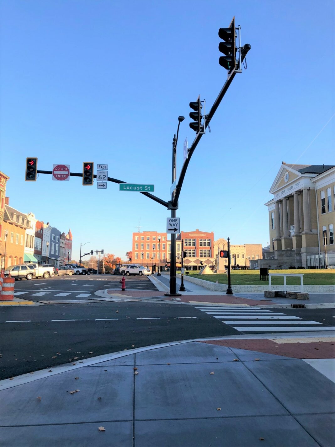 The revitalized downtown square features expanded sidewalks, enhanced lighting, new traffic lights, ADA compliant ramps, and crosswalks.