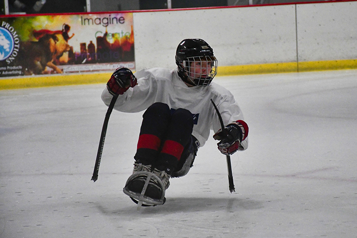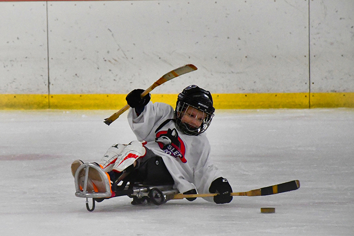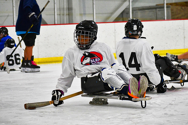 On the ice, Brayzen is a blur of motion. Because he’s a beginner, his sled includes wheelers designed to prevent him from tipping over. He also sits in a bucket built to support his back. Brayzen loves to pop wheelies for his fans. At the Sled Dogs’ Sept. 30 practice, eight family members cheered him on.