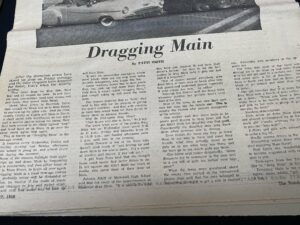 An Evansville Press article in the time capsule discusses the years-long trend of students from UE “dragging Main,” with a photo showing the former Strouse’s department store building on Main Street.
