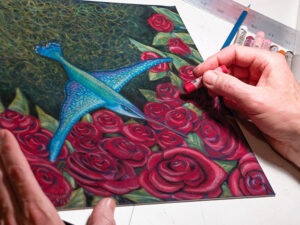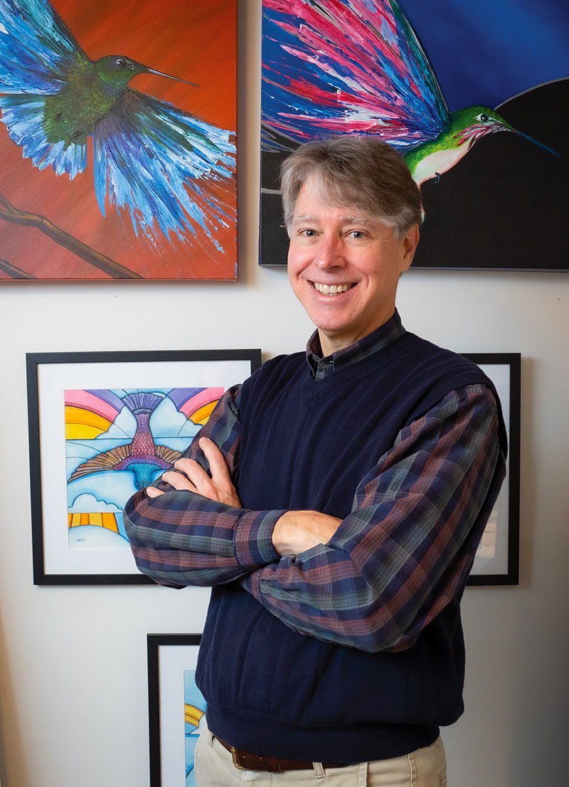 His work primarily consists of paintings, including watercolor and oil, though he has dabbled in other mediums like stained glass. Herbertz’s pieces on display in August at New Harmony, Indiana’s Black Lodge Coffee Roasters were avian-centric works titled “The Spirit of the Hummingbird.” In his home studio are more hummingbirds in all colors, in different places and positions, under sunlight or within the branches of a tree.
