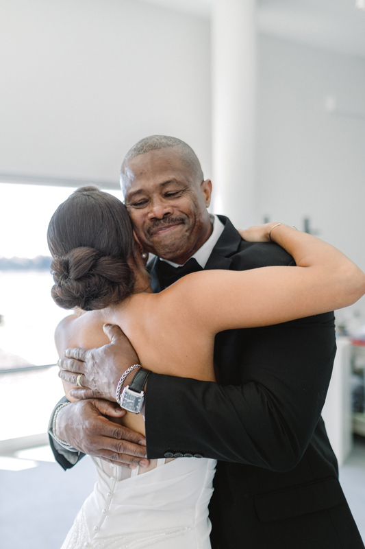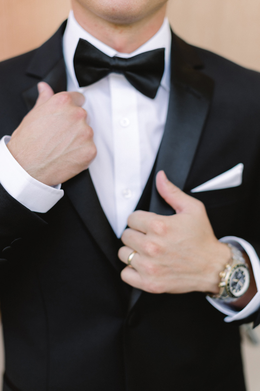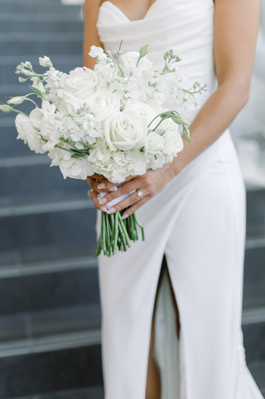 Cocktails, dinner, and dancing to live music took place inside the galleries and foyer. The sound of a baby grand piano, saxophone, cello, and violin filled the air. Decorations were in an elegant palette of white and gold, complemented by fresh roses and greenery. Their photographer captured the museum’s paintings and sculptures in the background. “We were able to use the entire museum for our celebration,” Payton says. “Our guests were able to look at the beautiful artwork during the evening.”