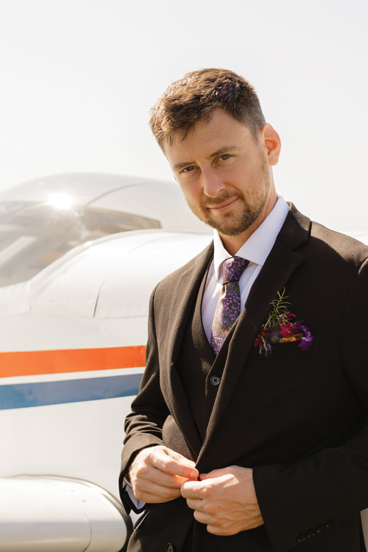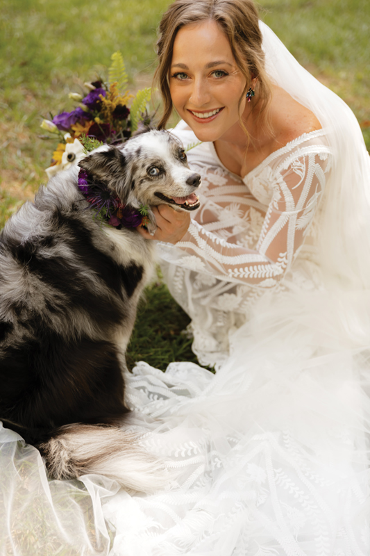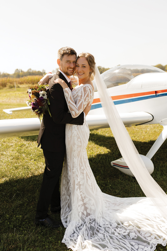 Their Oct. 5, 2024 ceremony unfolded on an 80-degree day under a blue sky. Friends provided music, transportation, parking, and even a vintage airplane for photos. The reception featured smoked ribs, a campfire, and a hayride wagon that the wedding party used as transportation to Nisbet Inn for a round of beers.