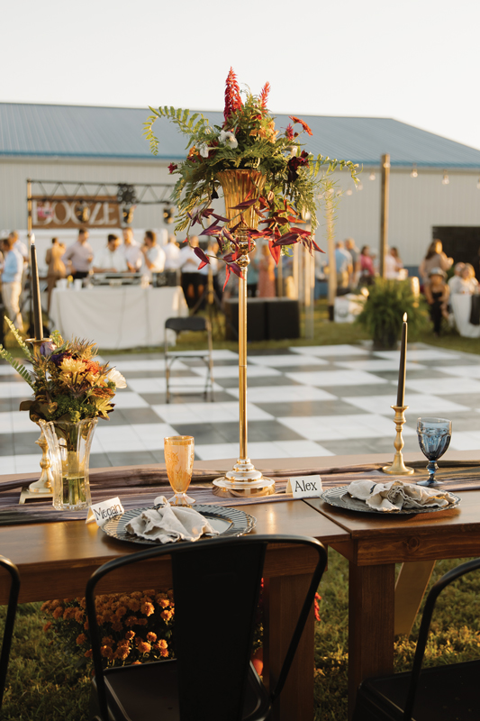 Over two years, their vision grew into an extraordinary outdoor wedding held on a family friend’s private property. Kelsey, an interior designer, spent months drawing up the perfect scaled floor plan using Google Earth and SketchUp. A runway between two fields was transformed into an unforgettable hometown celebration and Kelsey’s dream DIY wedding. “Almost every single detail — and I mean every — was handmade by someone we know and love,” Kelsey says.