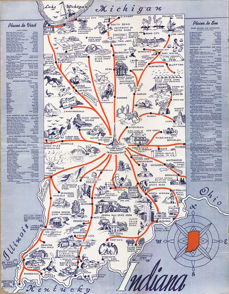 One look at this map of Indiana landmarks, and you may feel like you stepped inside a time machine. Produced in the 1940s, this guide to Hoosier hot spots is part of the Indiana Historical Society’s collection and demonstrates the state’s diversified interests as its tourism prospects prospered.