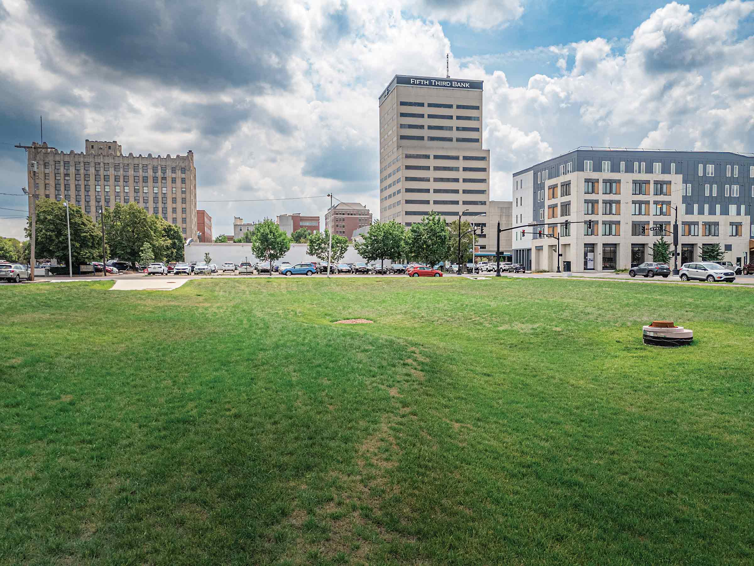 Toyota Trinity Stormwater Park is awaiting next steps. Bordered by Court, Vine, and Northwest Third streets, the site of the former Holy Trinity Catholic Church is to be used for stormwater infrastructure as well as park features.