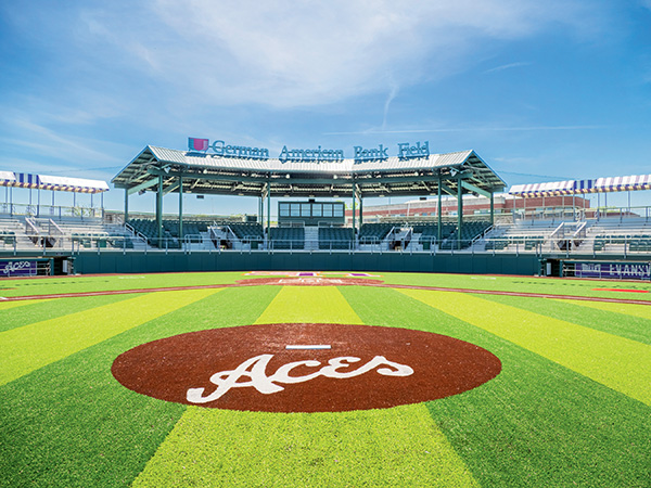 A massive University of Evansville logo, painted in the school’s colors of purple, white, and orange, looms behind home plate at the German American Bank Field at Charles H. Braun Stadium. Set off by the green of the brand-new AstroTurf laid during recent renovations, it makes quite a statement piece for an “office.”
