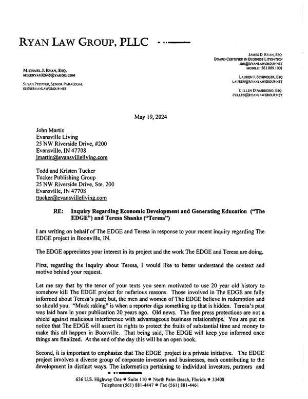The extent of Shanks’ participation in the EDGE of the Lakes project is not clear. Efforts to reach her were not successful, and Evansville Business received a letter from a Florida attorney in response to its inquiries about Shanks’ involvement. (Read the full letter below.)