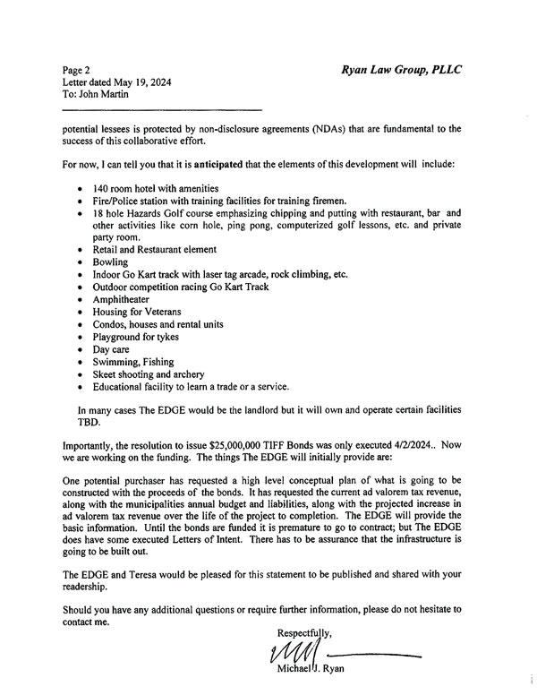 In addition to a 140-room hotel, the development plan for EDGE of the Lakes has an events center, training facilities for police and firefighters, stores and restaurants, housing for veterans, miniature golf, indoor karting, an arcade, an amphitheater, and more.