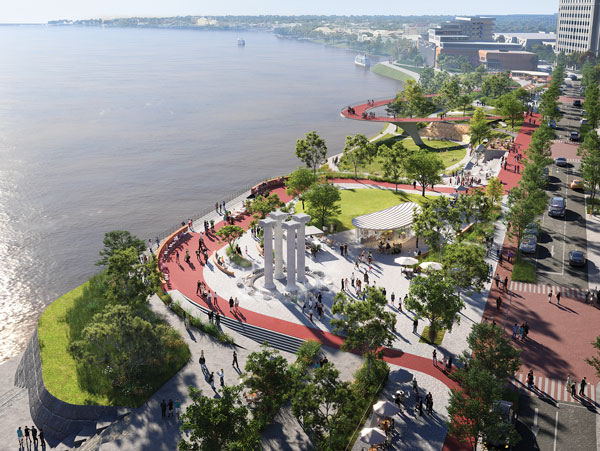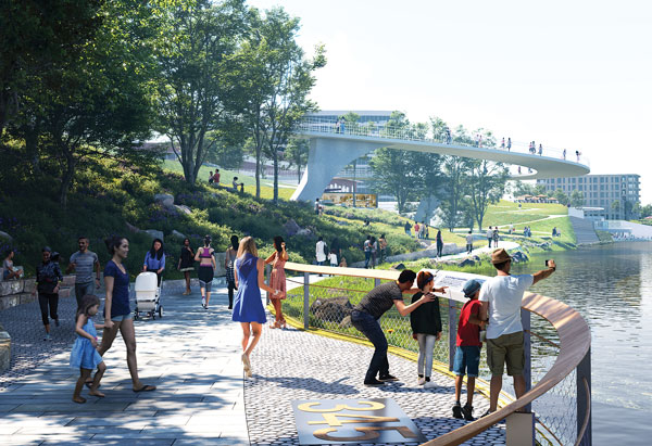 Want to experience the river up close? You can, at the bottom of grand stairs and terraces, where Sasaki’s design suggests a “play beach” as well as access to kayaks and jet skis.